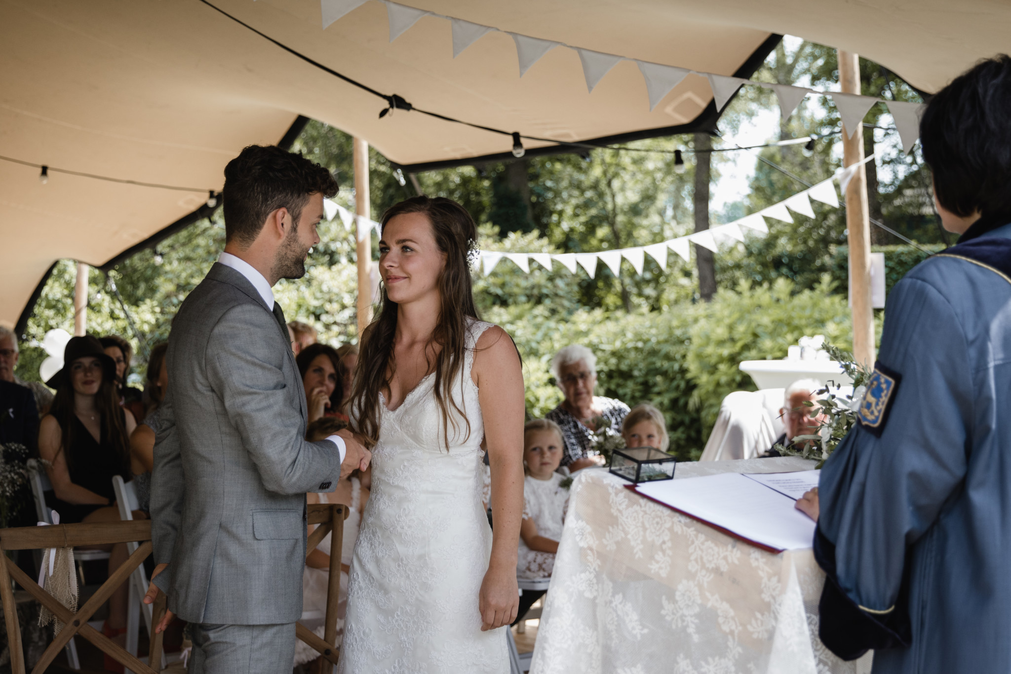 Na de fotosessie in het bos reden we terug naar het huis van de bruid, waar de daggasten al vol enthousiasme op het bruidspaar stonden te wachten. Vervolgens zocht iedereen een plekje in de tent, want er wachtte een heerlijke lunch (fijne bijkomstigheid – mét broodje kroket!). De dag begon zo direct al relaxt, ontspannen en gezellig.